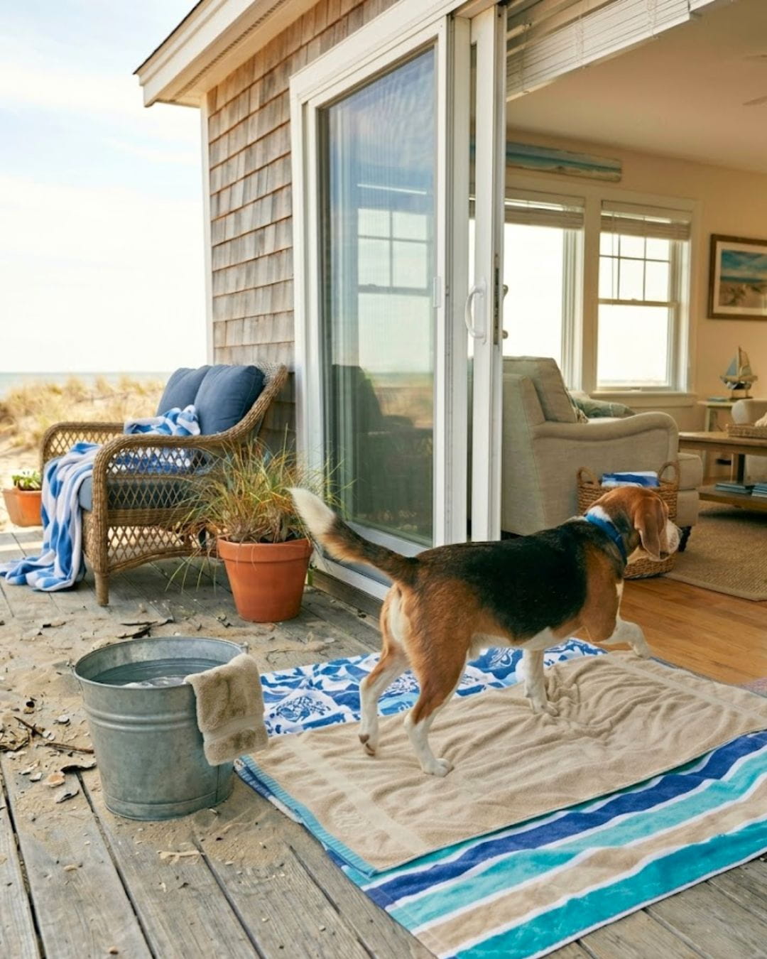 She has to keep a pile of wet and dry towels and a bucket of water in front of the door. To fight all that sand.